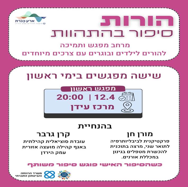 אנו שמחים להזמינכם להשתתף בסדרת מפגשים בנושא "הורות – סיפור בהתהוות", מרחב מפגש ותמיכה להורים לילדים ובוגרים עם צרכים מיוחדים.